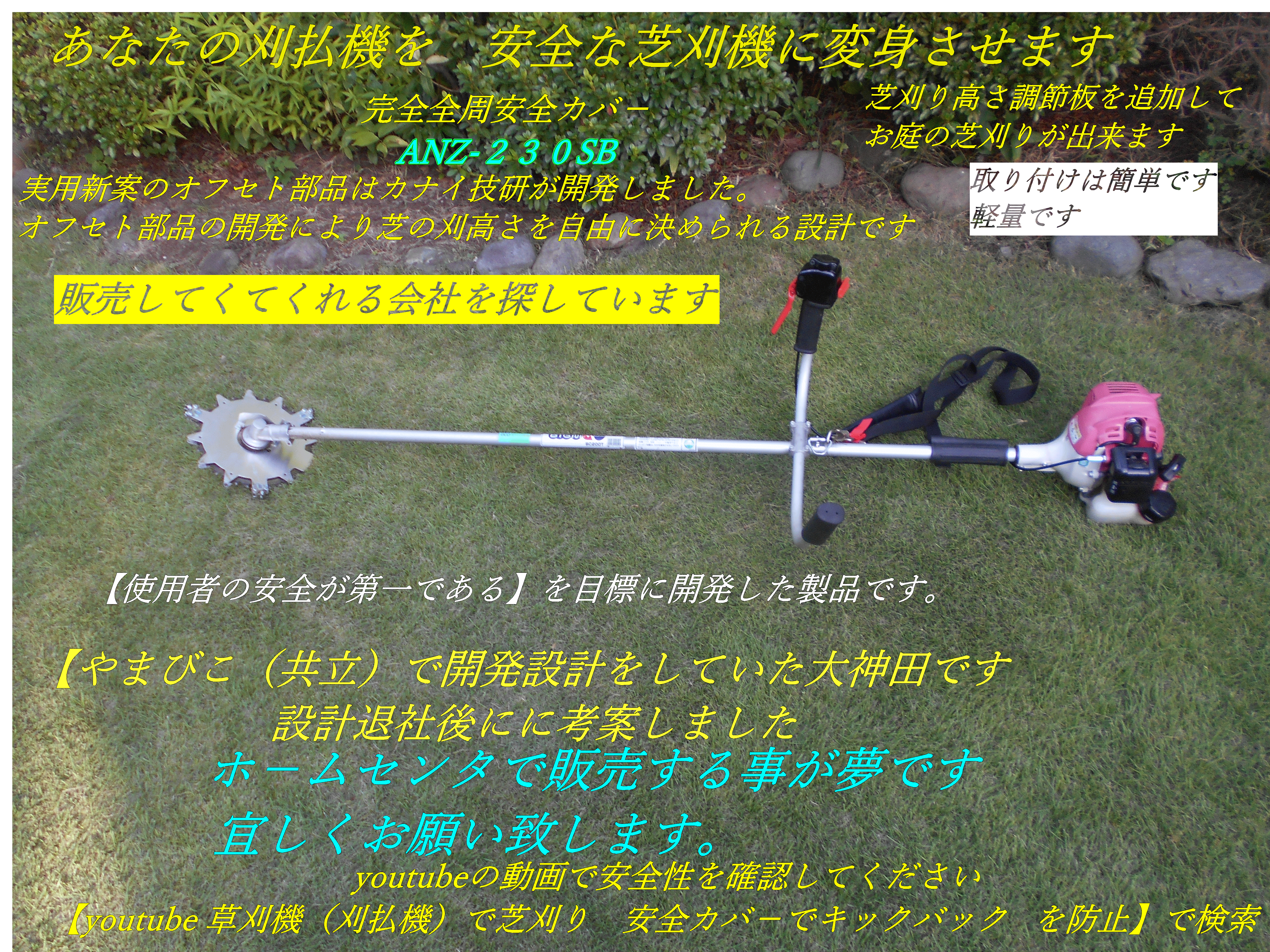 - カナイ技研は 自由な発想で 危険な刈払機を 安心して草刈作業ができるようにする【キックバック防止安全カバー】を開発設計をしました。新しいライフスタイルをご提案します。